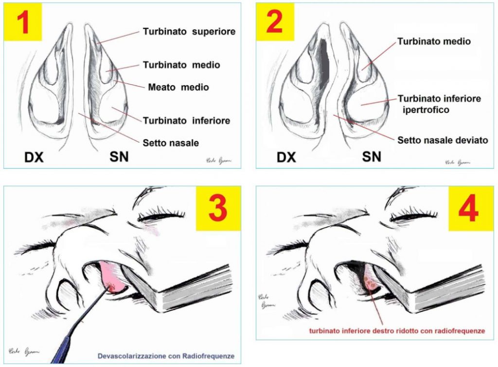 Schematicamente abbiamo quadri clinici di ipertrofia dei turbinati con setto in asse e quadri di deviazione settale con o senza ipertrofia dei turbinati. Come sempre le soluzioni possibili sono più di una e vanno valutate caso per caso.